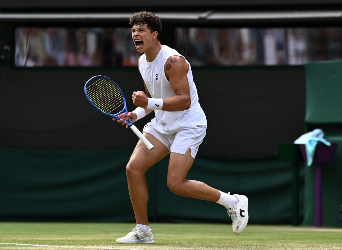 Ben Shelton of United States celebrates against Jannik Sinner of Italy during the Gentlemen's Singles quarter-final match on day ten of The Championships Wimbledon 2025 at All England Lawn Tennis and Croquet Club on July 09, 2025 in London, England.