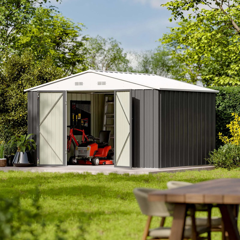 This massive storage shed is made from galvanized steel panels, giving it excellent weather resistance and durability. With its 10-by-8 footprint, it offers a cavernous 426 cubic feet of interior storage space, and its lockable doors allow you to keep all your gear secure (note: you’ll need to purchase the lock separately). The gabled roof quickly sheds rain and snow to prevent leaks, and four air vents promote air circulation to keep your items from getting musty or moldy.
